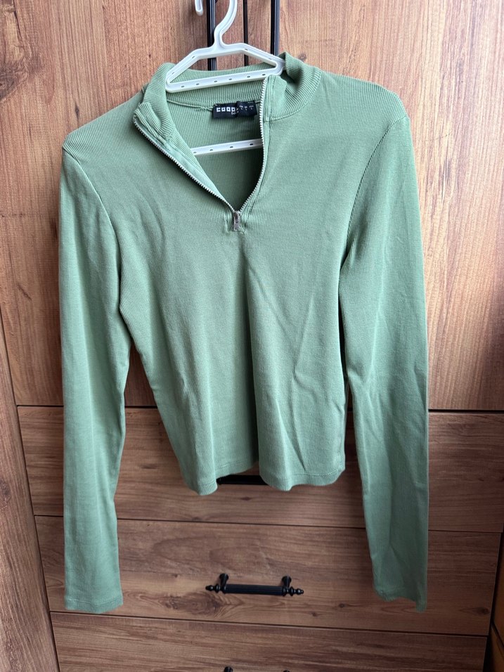 Fermuarlı yarım boğazlı, uzun kollu, vücuda oturan pastel yeşil kadın kazak. Yumuşak ve sıcak kumaştan, midi boyda, günlük rahat sokak stili için uygundur.