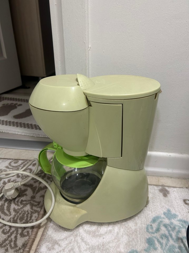 Pastel yeşil renkte, cam karaflı ve kompakt tasarımlı kahve makinesi. ☕