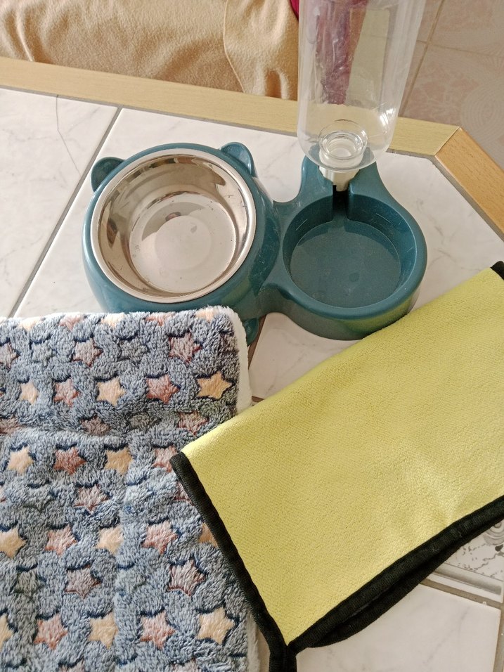 Pasel yeşil renkte, paslanmaz çelik mama kabı ve su dağıtıcısı içeren pet besleyici. Kolay mama ve su verme sağlar.