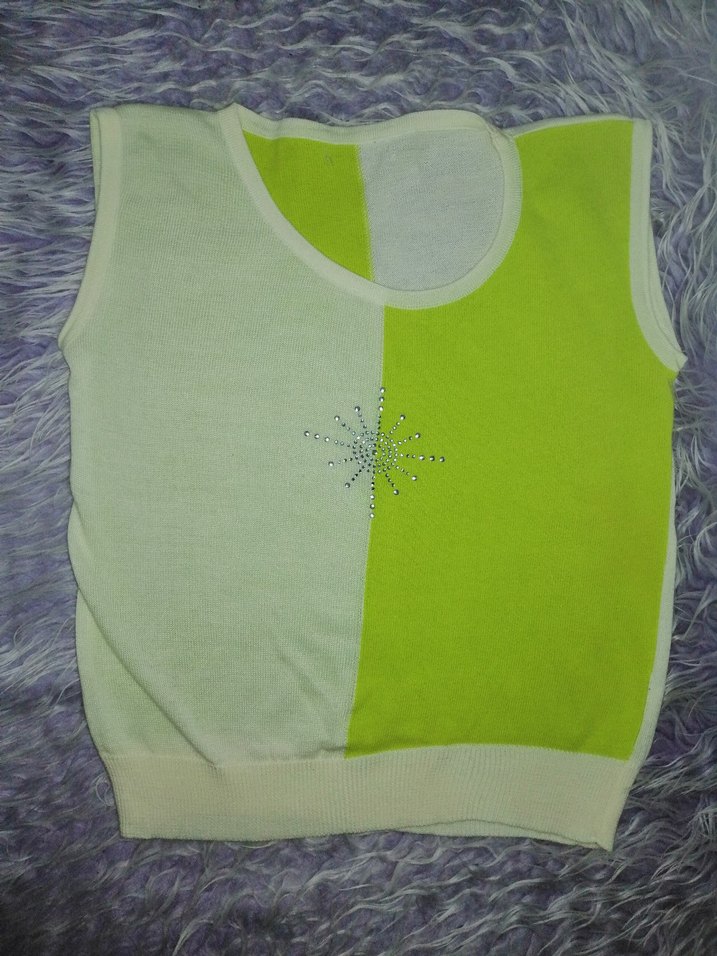 Kolsuz, bol kesim , pastel yeşil ve krem renk bloklu, nakış detaylı ve triko kumaştan. Yuvarlak yakalıdır.