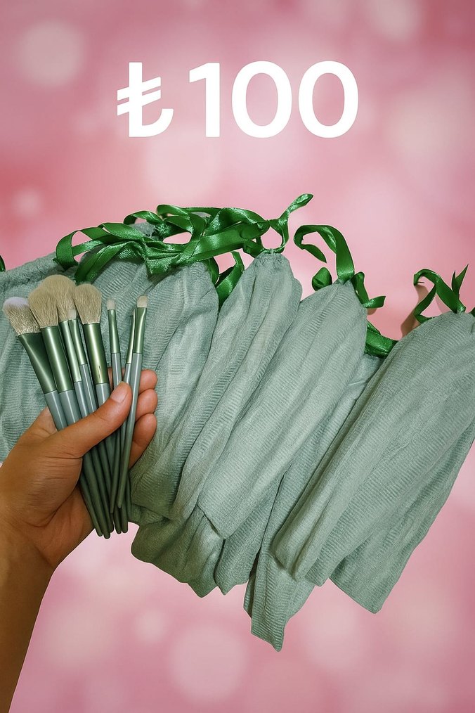 Pastel yeşil renkte, yumuşak kıllara sahip birden fazla makyaj fırçası seti, yeşil renkli torbalarda paketlenmiştir. Fiyatı ₺100.