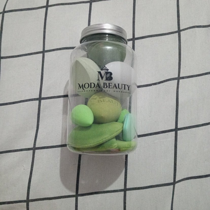 MODABEAUTY markalı, farklı boyut ve şekillerde pastel yeşil makyaj süngerleri seti, şeffaf kavanoz içinde saklanmıştır. LÜTFEN ALMADAN ÖNCE MESAJ ATINIZ STOK BİLGİSİ İÇİN