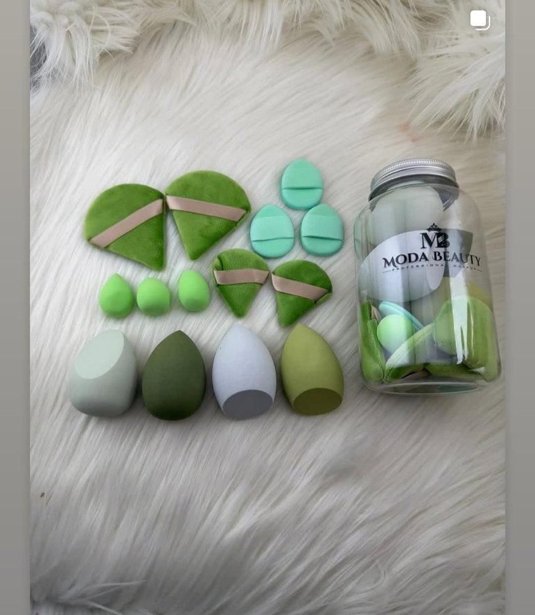 Pastel yeşil tonlarda, farklı şekil ve boyutlarda makyaj süngerleri seti. Şeffaf kavanozda saklanır.