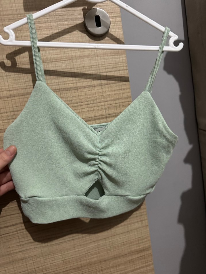 İnce askılı, pastel yeşil mini sütyen. Düz ve yumuşak dokulu kumaştan, athleisure ve streetwear tarzına uygun.