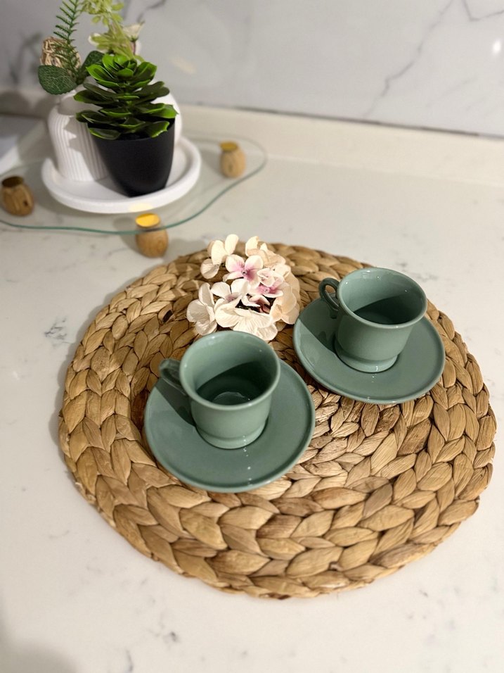 Pastel yeşil seramik fincanlar ve tabaklardan oluşan takım, sıcak içecekler için uygundur. Pürüzsüz yüzeyi zarif bir görünüm sunar. ☕