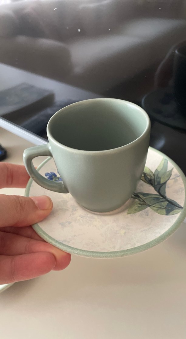 Pastel yeşil seramik fincan, çiçek desenli uyumlu tabağı ile birlikte. Pürüzsüz yüzey ve rahat tutma sapı sunar. ☕hiç kullanılmadı hediye gelmişti