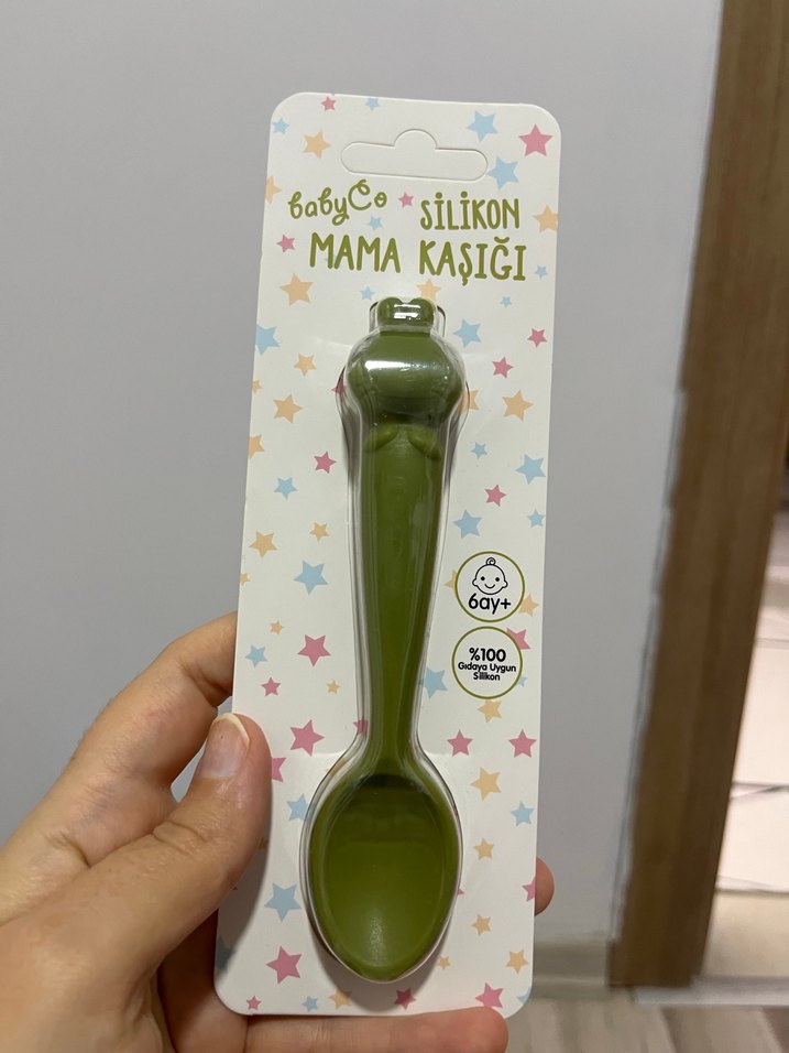6 ay ve üzeri bebekler için pastel yeşil silikon mama kaşığı. Yumuşak ve %100 gıda onaylı silikon malzemeden üretilmiştir.