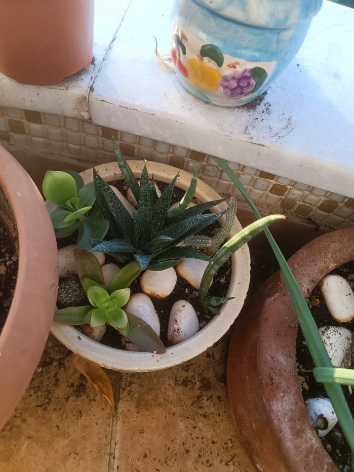 Pastel yeşil renkte, küçük sukulent bitkilerinin beyaz dekoratif taşlarla düzenlendiği saksı. Doğal ve sade bir dekorasyon ürünü.