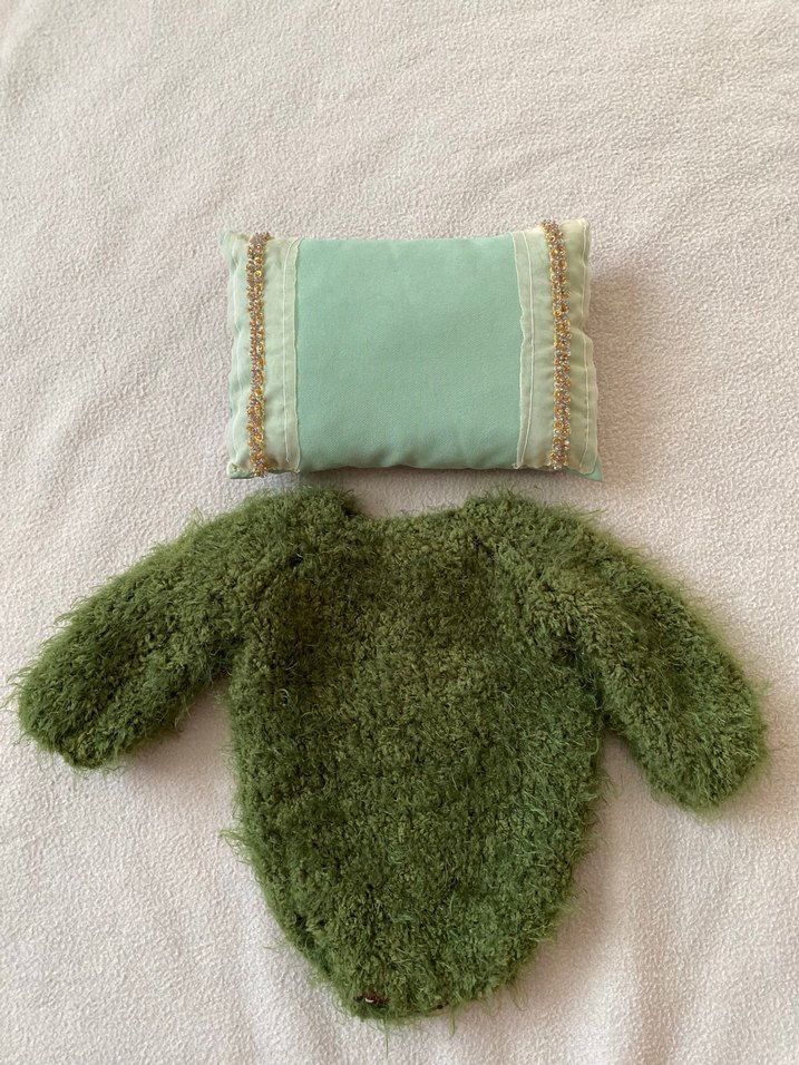 Pastel yeşil yastık, ince süslemelerle ve yumuşak dokulu yeşil peluş bebek kıyafeti. Desensiz ve rahat bir set. ️ Yenidoğan bebek için uygundur.