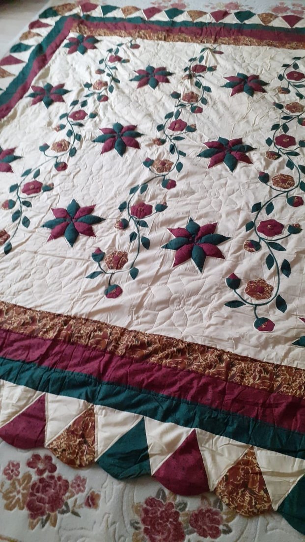 Krem zeminde bordo işlemeli çiçek desenleri ve bordo-yeşil detaylı bordürlü yatak örtüsü. Sıfır ayar 3 yastık 1 pike örtü