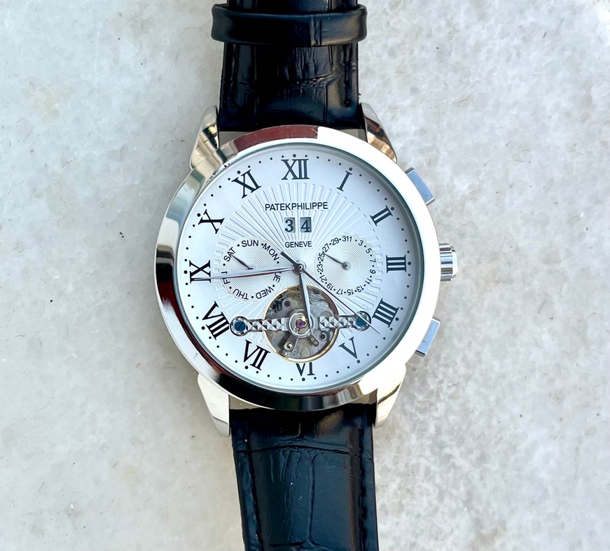 Patek Philippe erkek saati, beyaz kadran, Roma rakamları, tarih göstergesi ve siyah deri kayış ile modern klasik tarzı bir araya getirir.Tertemiz herhangi bir defosu kusuru yoktur .Turbillon özellikli otomatik mekanizma kolda çok klas duruşu olan harika bir saattir.Duruşu ve diğer resimleri ek sayfalarda bulabilirsiniz