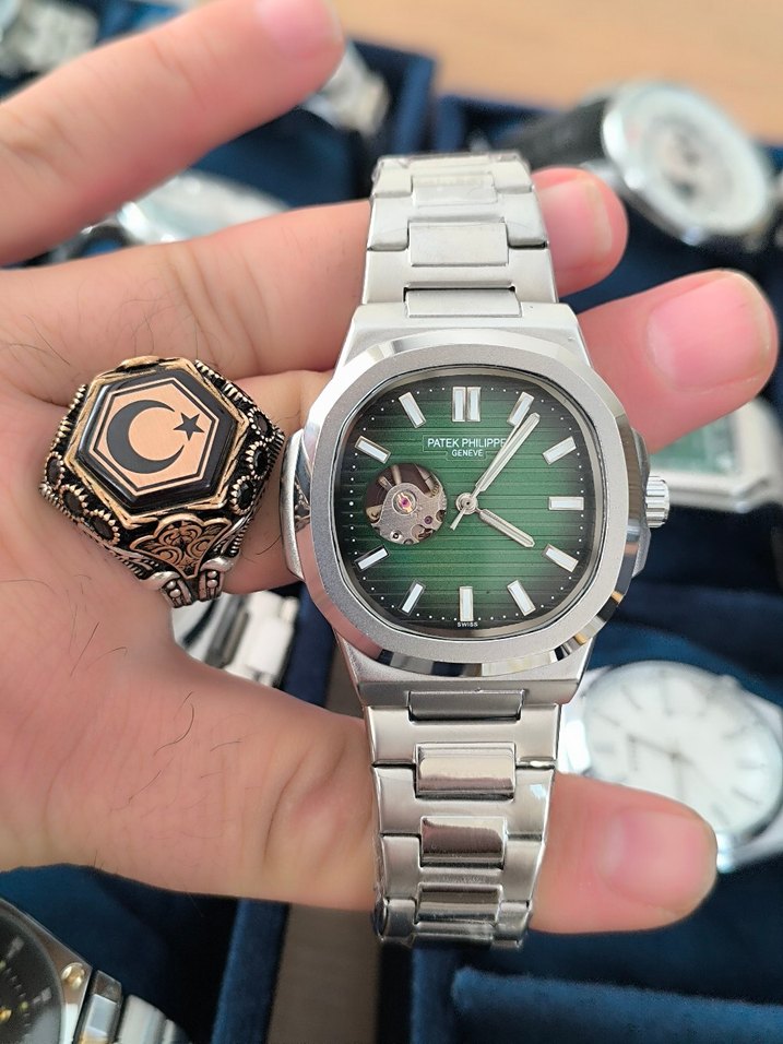 Patek Philippe erkek kol saati, yeşil kadran ve gri paslanmaz çelik bilezikle klasik ve modern tarzı bir araya getiriyor. ⌚