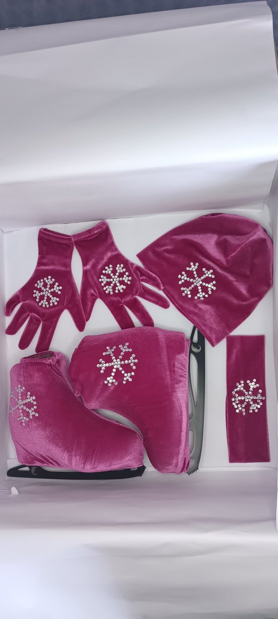 Pembe kadife kumaştan yapılmıştır. Paten koruyuvu kılıf, bere, eldiven ve saç bandı. İsteğe göre farklı renkte yapılabilir. Sofır üründür. ✨