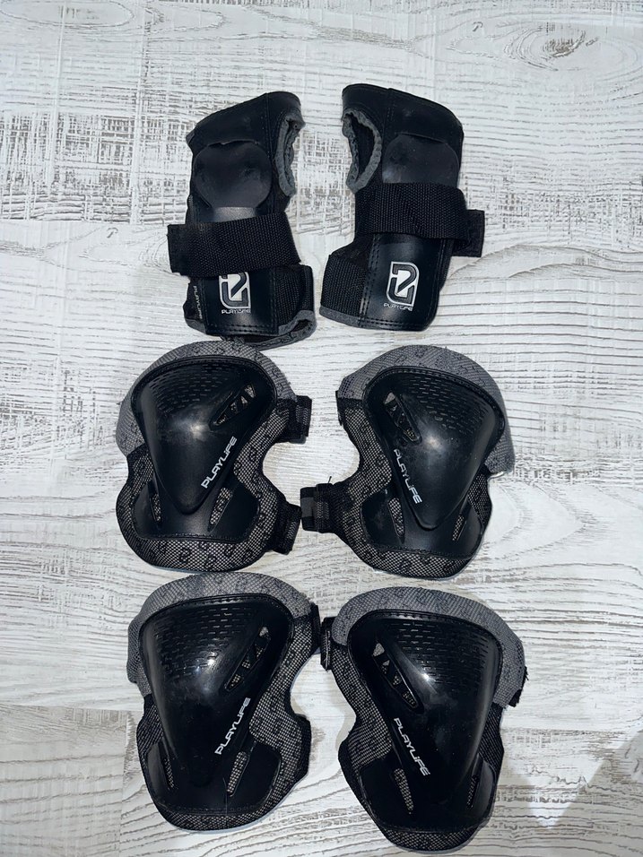 Siyah Koruma Takımı. Paten, kaykay vb sürerken güvenli kullanım sağlar. Herhangi küsür yoktur. Çok az ve dikkatli kullanılmış