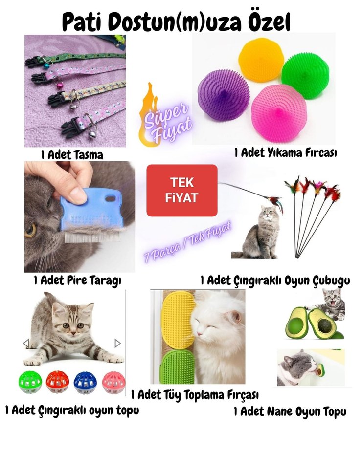 Renkli tasma, pire tarağı, nane oyun topu, tüy toplama fırçası, çingıraklı oyun çubuğu ve daha fazlasını içeren kedi aksesuar seti. 7 parça tek Fiyat... Sıfır ürünlerdir..