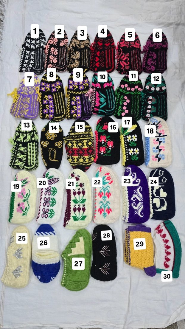 Çiçek ve geometrik desenlere sahip, çeşitli renklerde el işi örgü çoraplar. Seçim için numaralarla işaretlenmiştir. fiyat için mesaj atınız
