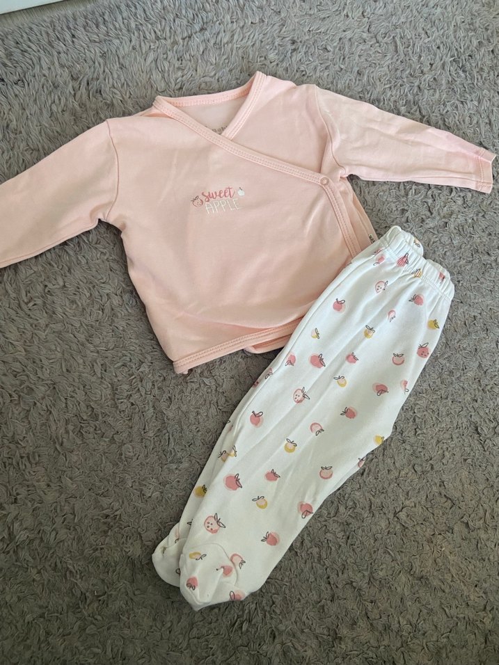 Pastel pembe örgü uzun kollu üst ve desenli pantolondan oluşan bebek kız takımı. Üst, çıtçıtlı yan kapamalı, pantolon sevimli hayvan desenli.