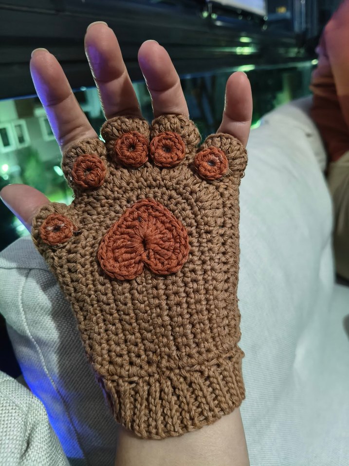 Kahverengi, örgü parmakları açık kadın eldiveni. Kalp ve daire desenleriyle rahat bir bohem, retro tarz sunar.