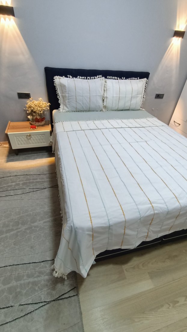 İnce nakışlı çizgiler ve püskül detaylarıyla beyaz yatak örtüsü, yatak odasına yumuşak ve şık bir dokunuş katıyor ️. Sayfamı takip edebilirsiniz Özel ölçülerde dikim mevcuttur