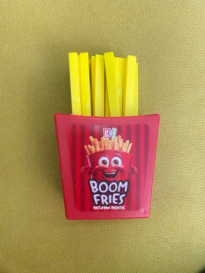 Renkli, patates kutusu şeklinde çocuk oyuncağı. Üzerinde "FRIES, BOOM, go, PATLAYAN PATATES" yazılıdır.
