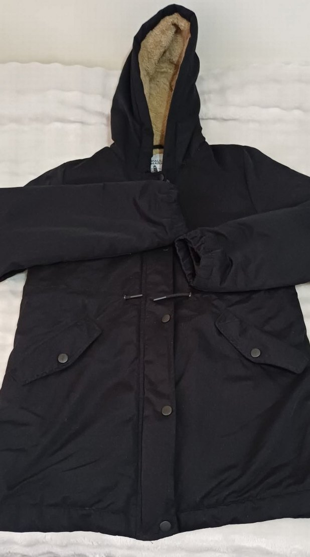 Bu siyah çocuk mont, kapüşonlu fermuarli ve düğmeli kapamalı, uzun kollu ve normal kesimdir. İç kısmı yumuşak ve sıcak tutan kumaşla kaplıdır.