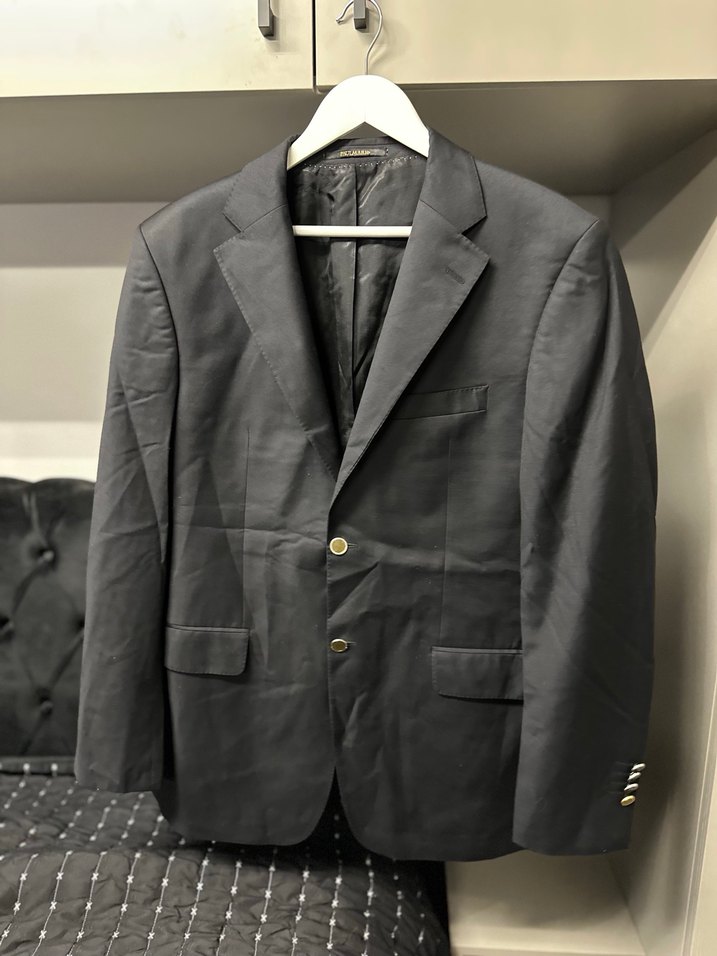 Paulmark siyah renkte, düğmeli ve düz desenli erkek ceketi. Normal kesim, uzun kollu ve klasik şıklık sunar. Ofis için uygundur.