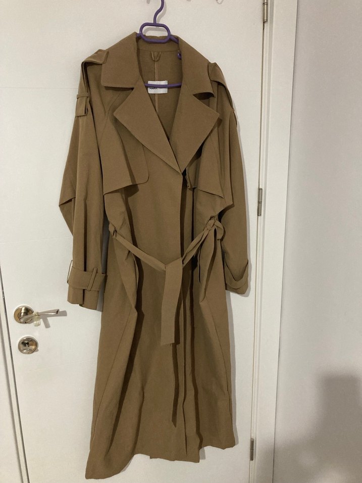 HİÇ KULLANILMADI! Beden ölçüleri: 130 cm boyu, 70 cm koltuk altı mesafesidir. Bej renkli, kuşaklı, uzun ve bol kesim kadın trençkottur. Strappy kollu ve yaka detaylıdır, sentetik kumaştan üretilmiştir.