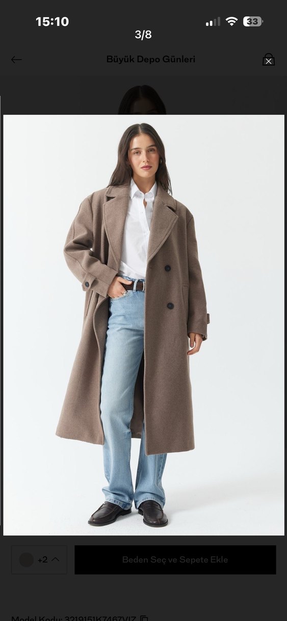 Oversize kesim, çift düğmeli, geniş yaka ve düğmeli manşetlere sahip kahverengi uzun kaban. Rahat kesim ve diz altı boyda. Vizm kaban yumuşacık tüylenmeyen kumasıyla