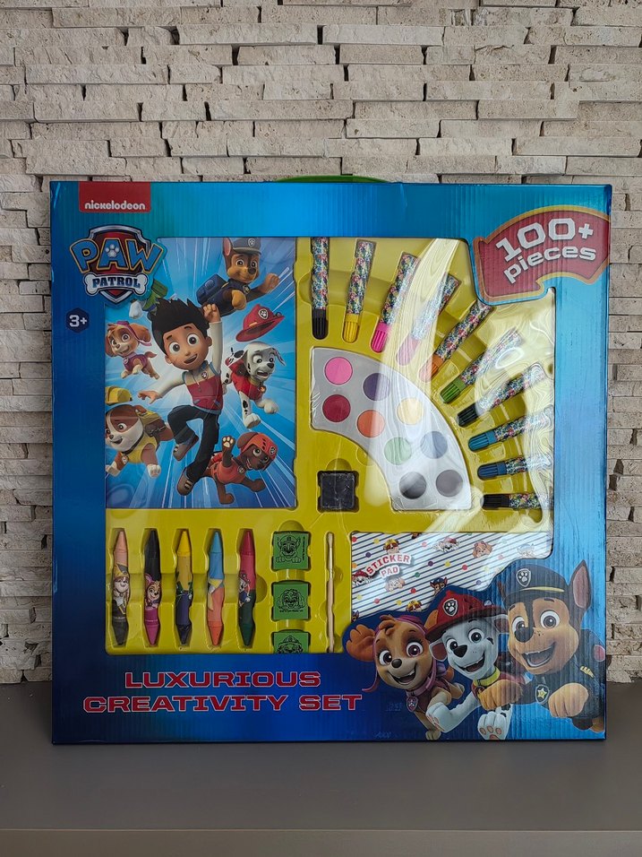 Paw Patrol temalı, 100'den fazla parça içeren renkli ve çeşitli sanat malzemeleriyle dolu yaratıcılık seti.