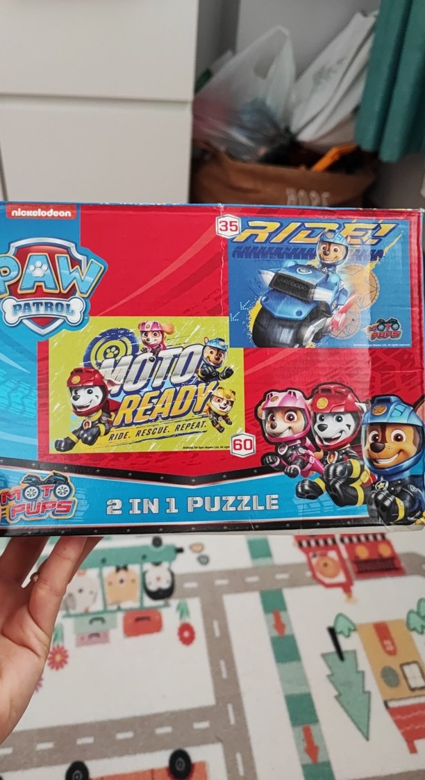 Renkli PAW Patrol yapboz seti, 35 ve 60 parçalı iki yapboz içerir. Motorlu karakterlerle hareket dolu bir tema sunar. Parça boyutlarının elim üzerinde göstermeye çalıştım. Çocuklarda zihin geliştirme, parçadan bütüne gitme kabiliyetini oldukça destekler.