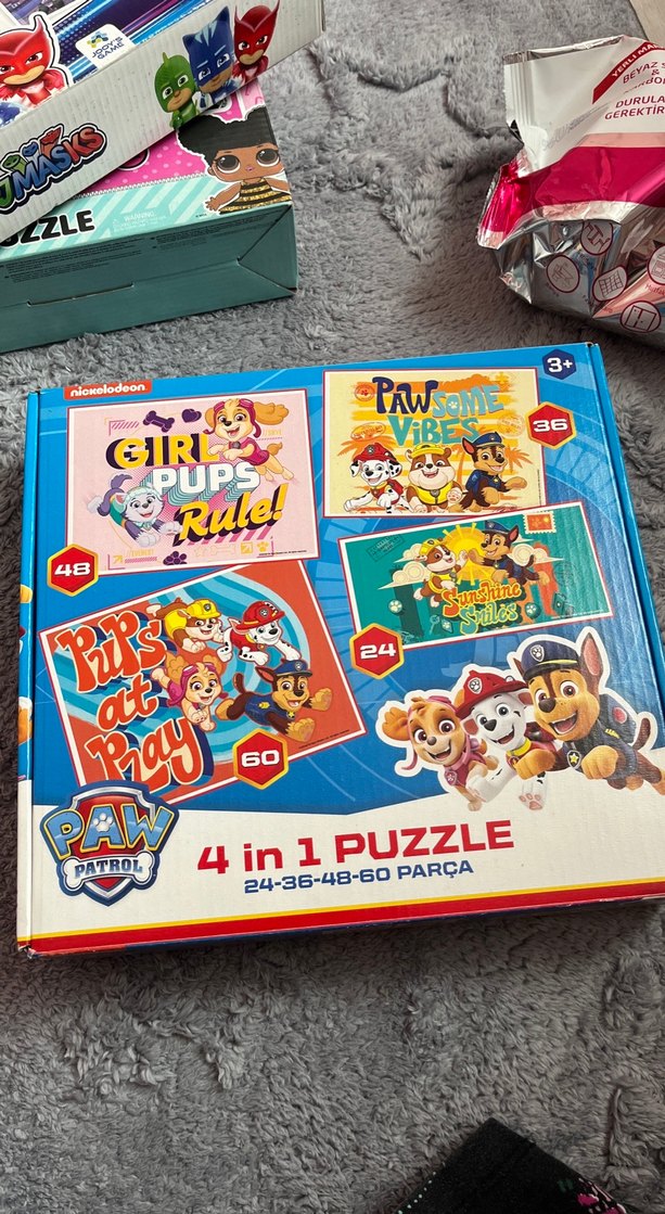 Paw Patrol karakterlerinin yer aldığı, 24, 36, 48 ve 60 parçalı dört farklı renkli puzzle seti.