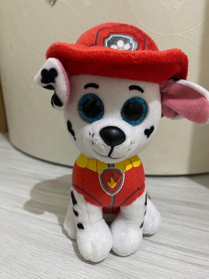 Kırmızı şapka ve kıyafet giymiş, büyük mavi gözlü yumuşak dokulu renkli Dalmaçyalı peluş oyuncak.