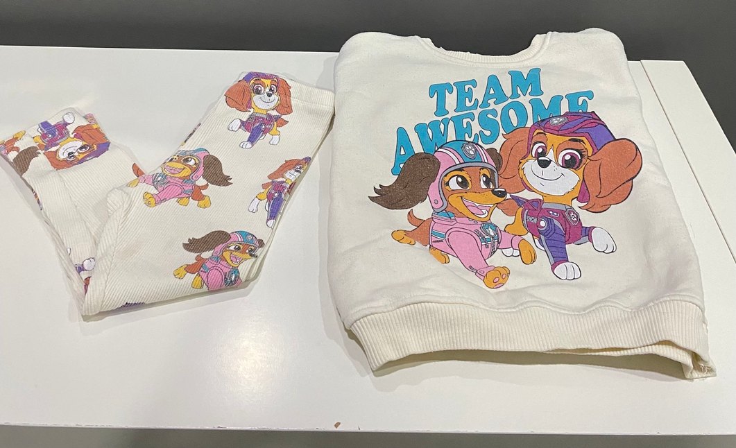 Paw patrol desenlerine sahip tayt takımı bedeni 3-4 yaş ama kalıp küçük 2 yaşa daha uygundur.Severek çok giydiğimiz bir takım solma var,üstte ve altta lekeler ve tiftiklenmeler var gördüklerimi ekledim o yüzden çok uyguna yüklüyorum ev giyimine uygundur lütfen bakarak alınız,marka temsilidir