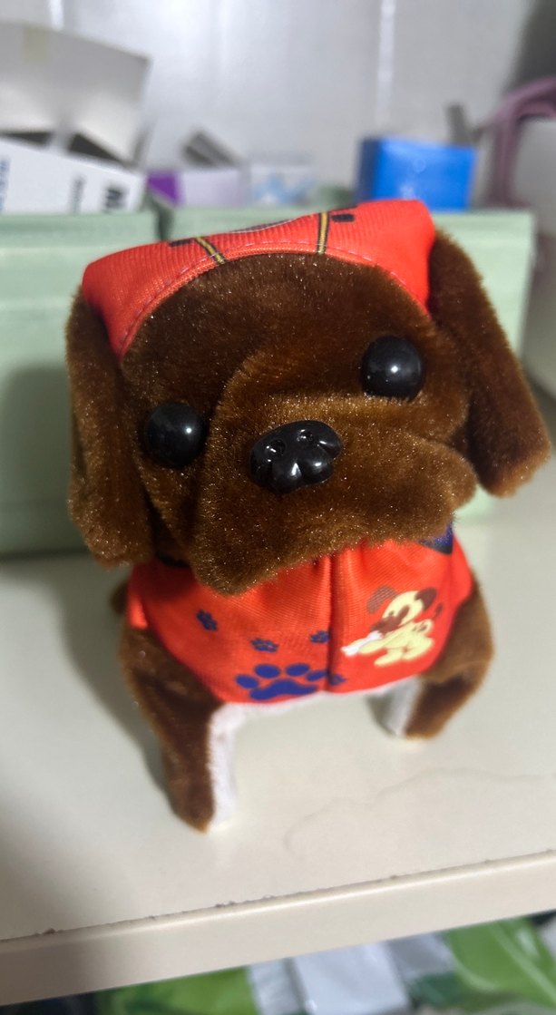 Yumuşak kumaştan yapılmış kahverengi peluş köpek oyuncak, renkli kırmızı kıyafet ve pati desenleriyle.