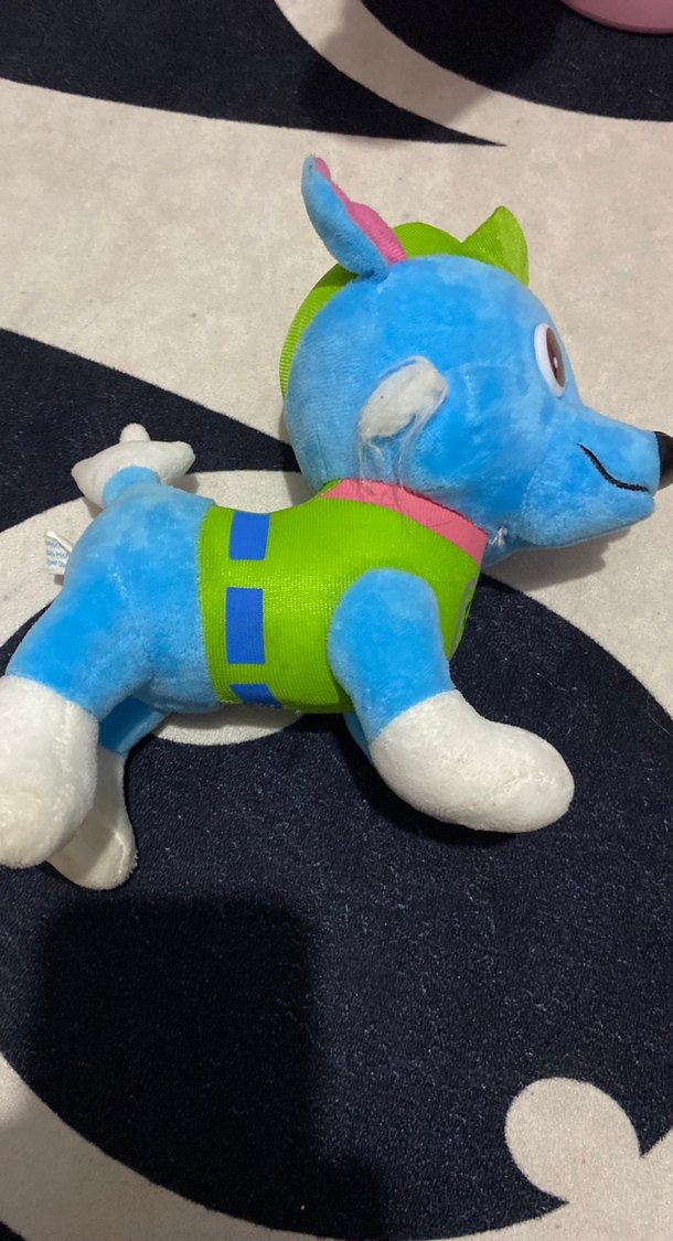 Yumuşak kumaştan yapılmış, mavi gövde ve yeşil-beyaz detaylara sahip renkli peluş oyuncak. Nakışlı yüz ifadesi bulunur.