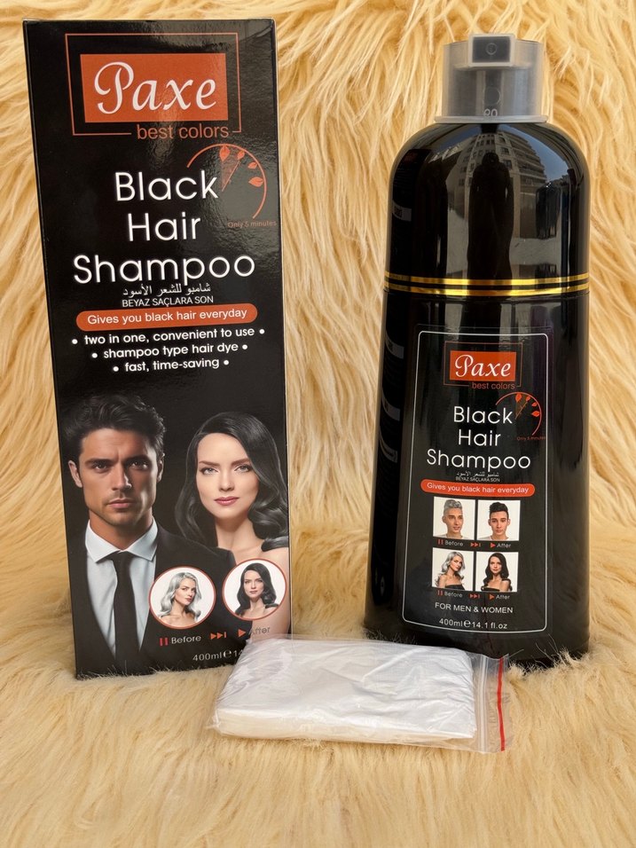 Paxe Siyah Saç Şampuanı, saç boyama ve şampuanı bir arada sunar. Erkek ve kadınlar için uygundur, her kullanımla siyah renk verir ve zamandan tasarruf sağlar.