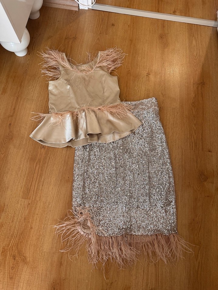 Bej renkli,ve işlemeli abiye alt üst takım ozel dikim 38 beden dizaltı . Kolsuz, bohem tarzıyla partiler için uygun, vücuda oturan kesim.