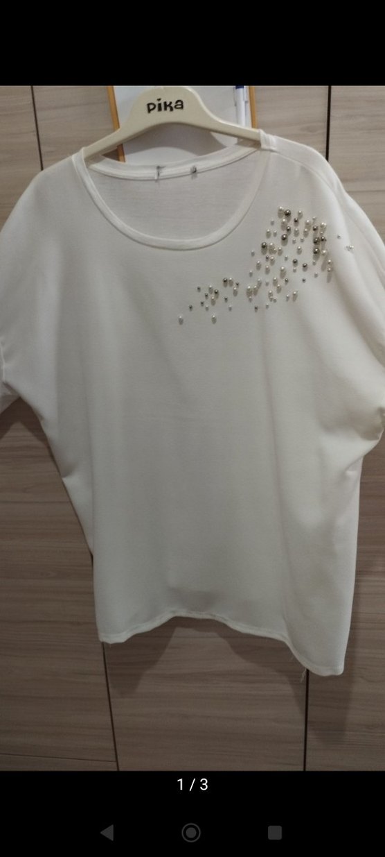 Beyaz renkli, kısa kollu ve yuvarlak yakalı kadın bluzudur. Yumuşak sentetik kumaştan üretilmiş, bol kesim ve kısa boydadır. Omuz kısmında payet detayları bulunur, trend sokak stiline uygundur.