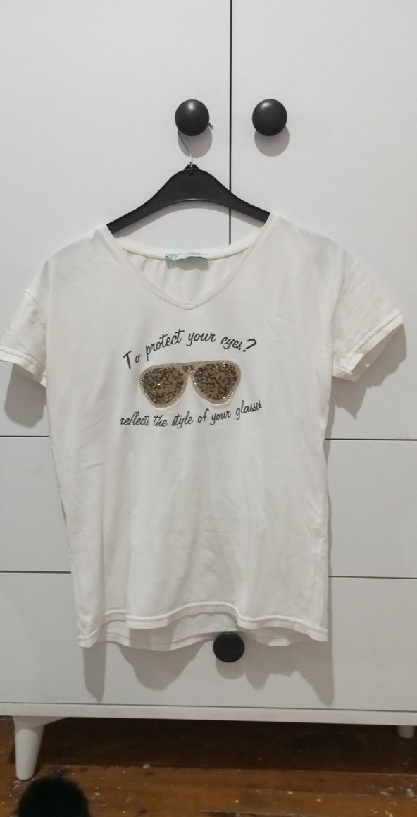 Beyaz, kısa kollu, pamuklu, bol kesim ve bisiklet yaka tişört. Payet detaylı güneş gözlüğü baskısı ve yazılı tasarım içerir. Rahat ve günlük kullanıma uygun. ☀️