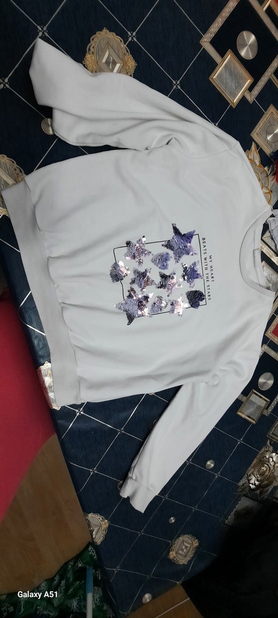 Beyaz uzun kollu, rahat kesim sweatshirt. Önünde payetli yıldız desenleri bulunur. Yumuşak kumaştan, günlük kullanım için uygundur. ⭐ az kullanıldı orta kalınlıkta sweatshirt