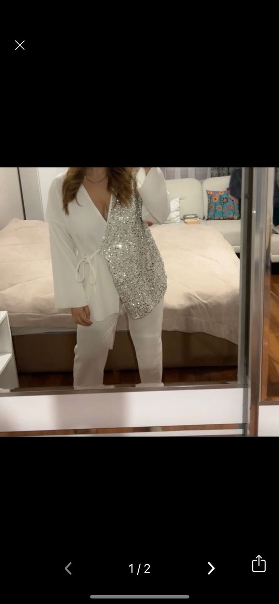 Beyaz kadın takımı, bol kesim, uzun kollu ve V yakalıdır. Bir tarafı payetlerle süslenmiş, sentetik kumaştan, düğün ve şık günlük kullanım için uygundur. ✨ hiç giyilmedi