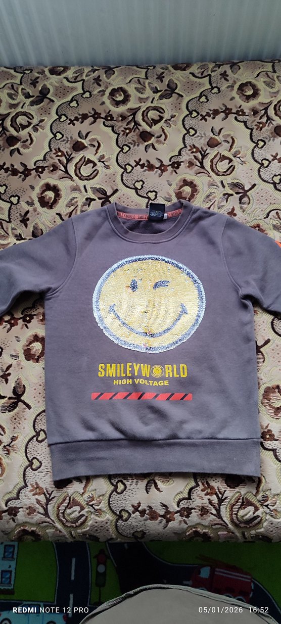 Yuvarlak yaka ve uzun kollu, bol kesim gri erkek sweatshirt. Yumuşak kumaştan, payetli gülümseyen yüz baskısı ve 'SMILEYWORLD HIGH VOLTAGE' yazısı bulunur.