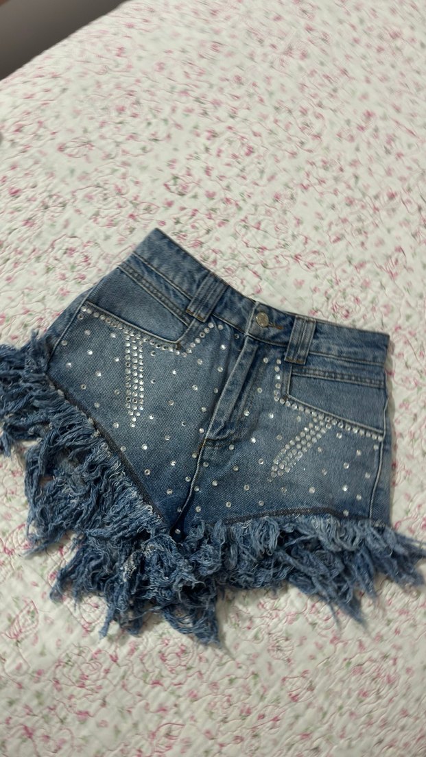 Renkli nakışlar, payet detayları ve püsküllü kenarlarıyla bohem tarzında, bol kesim mavi kot şort. Temiz şort hiç giyilmedi