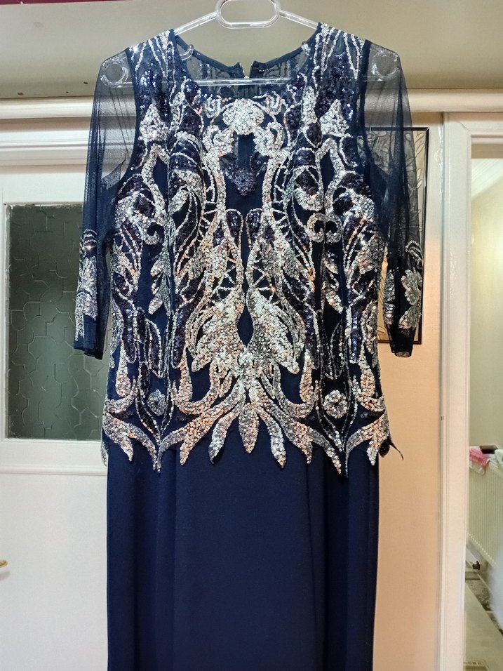 42 beden bir kez giyilmis ürün uzun kollu ve işlemeli payet desenlere sahip lacivert uzun ve vücuda oturan abiye elbise. Düğün ve özel günler için uygundur. ✨