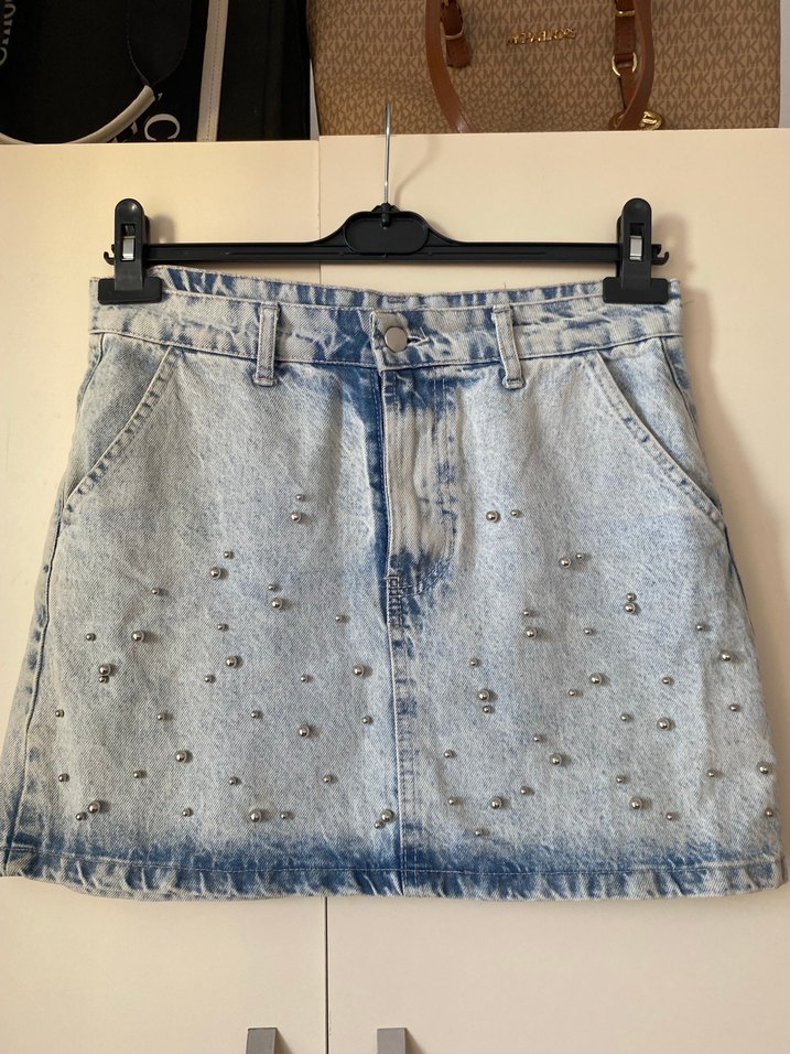 Gevşek kesim mini kot etek, mavi ve gri batik desenli, payet detaylarıyla rahat ve şık bir sokak stili sunar.