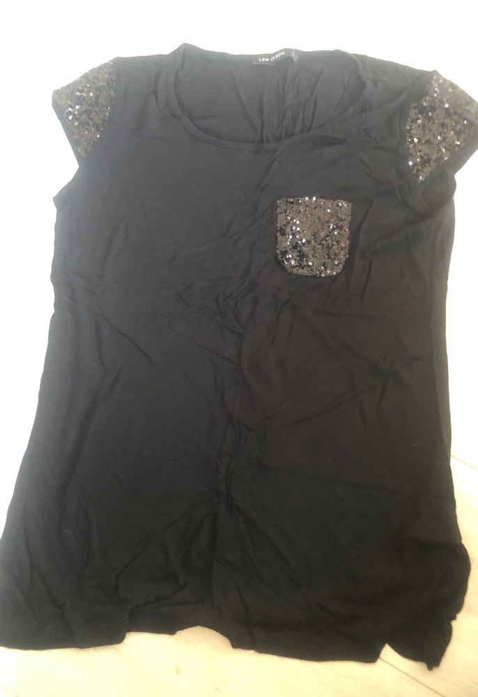Siyah bluzu, payetli kısa kollara ve cep detayına sahip. Salaş kesim, yuvarlak yaka ve ipeksi dokusu ile rahat ve şık. ✨