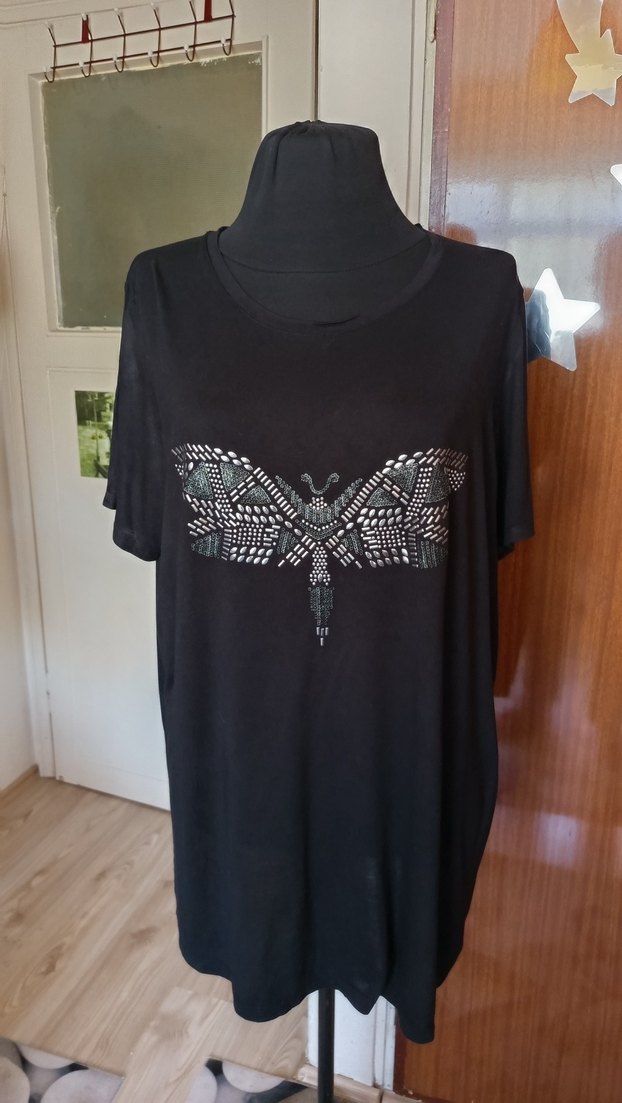 Kısa kollu, yuvarlak yaka, bol kesim siyah. Payet işlemeli kelebek baskısı ve gotik tarzıyla günlük kullanıma uygun.