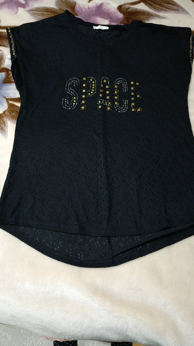 Payet işlemeli 'SPACE' yazısı bulunan, kısa kollu ve bisiklet yaka, sentetik kumaştan yapılmış siyah, normal boy tişörtü. Trend sokak stili için uygundur. iki kol arası 54 boy 77 cm