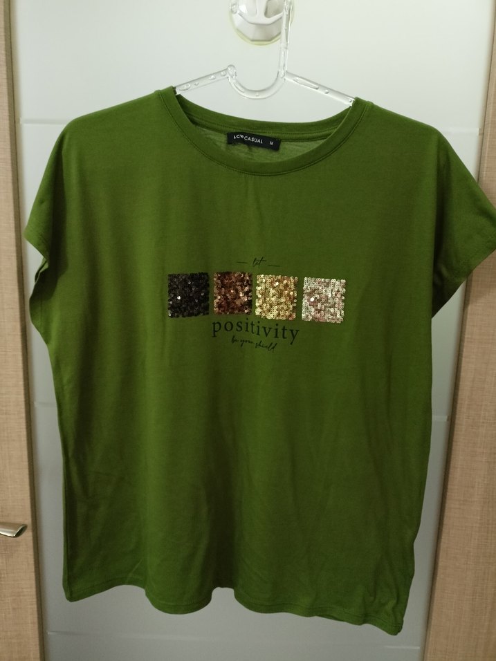 Koyu yeşil pamuklu kadın tişörtü, kısa kollu ve bisiklet yaka. Bol kesim ve kısa boy, önünde payetli kareler ve "positivity" yazısı bulunur sıfır ürün...