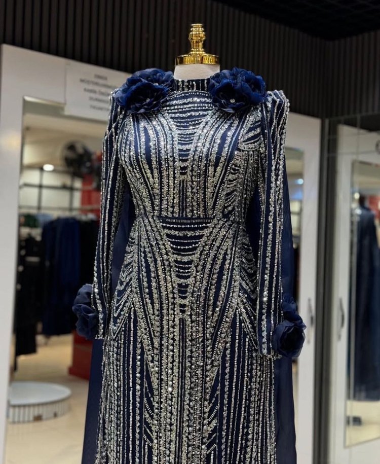 Lacivert uzun abiye elbise, payet işlemeli ve nakışlıdır. Tekne yaka ve uzun kolludur, düzenli kesim ve parlak görünüm sunar. Bir defa giyildi hiçbir sorunu yok